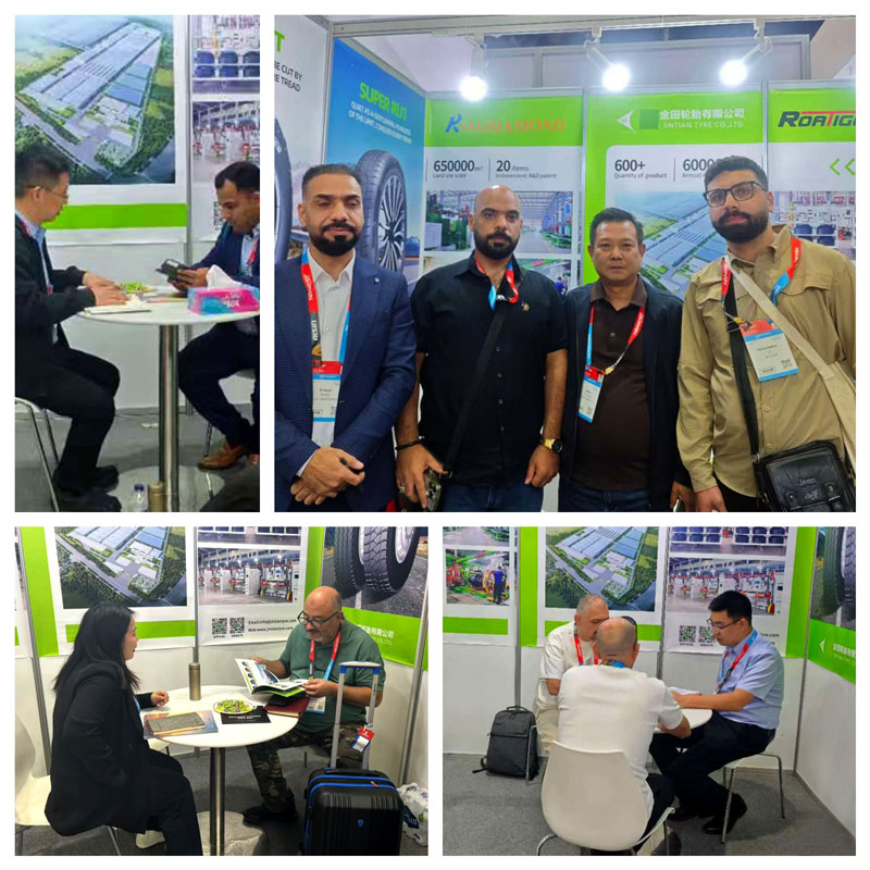 面向乘用车市场的半钢轮胎矩阵,则以"绿色科技"彰显竞争力。涵盖HP高性能、UHP超高性能、SUV及轻卡载重等5大系列的产品,搭载金田自主研发的低滚阻技术与高抓地耐磨配方,实现了滚动阻力降低10%的技术突破,既契合全球绿色出行趋势,又能应对中东高温路况下的性能考验。不少采购商对其轮胎花纹及产品性能赞不绝口,更有多家经销商当场达成初步合作协议。
